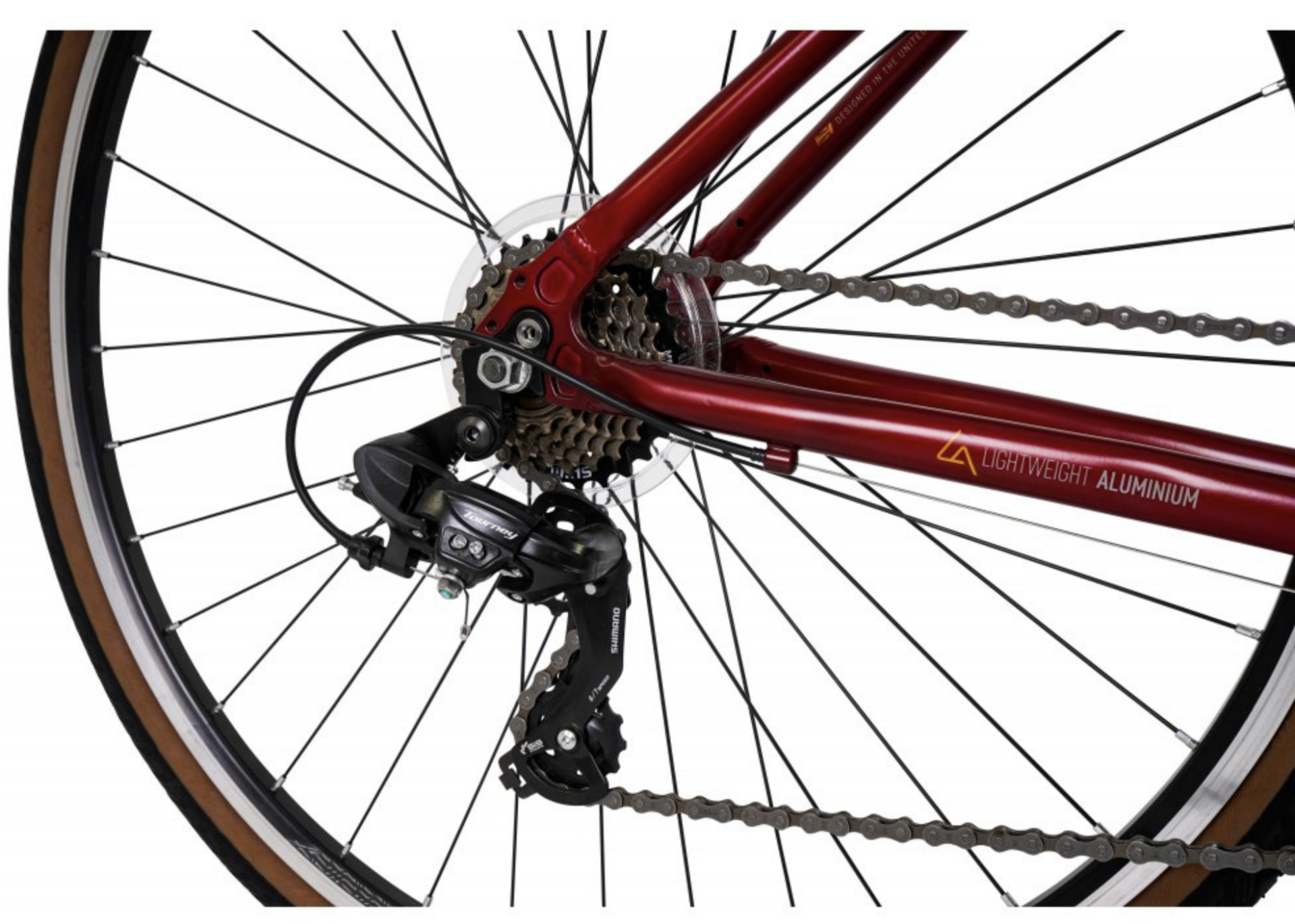 Stepping it up a gear from our Explorer 1.0 models, the upgraded 2.0 option offers 21 speed Shimano transmission, hydro-formed alloy frame and quality tan coloured sidewall Kenda tyres. The eye catching metallic red paint job also adds to the premium look.