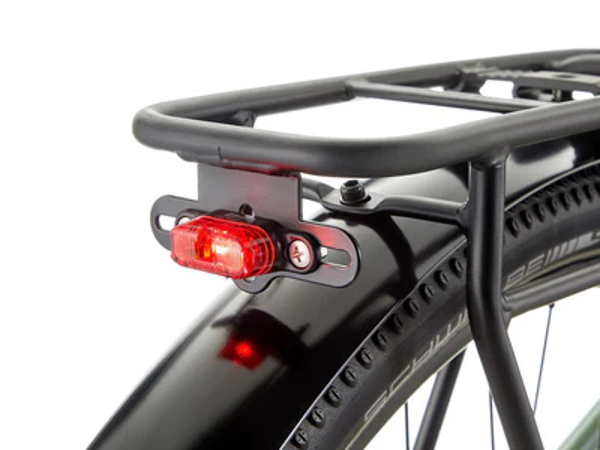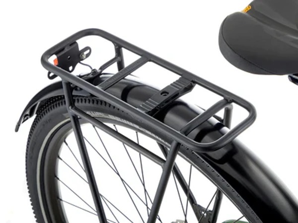 For those that love the idea of carrying gear with the assistance of an e-MTB the El Kahuna SUV is the answer! Like its sibling, the El Kahuna, the SUV features a sturdy aluminum frame and 29” wheels. The big differences are the addition of front and rear lights, and a rear rack which is integrated with a fender keeping you cleaner while you carry that camping gear up that big gravel road. A 100mm fork smooths out the bumps, and powerful disc brakes keep you in control while you rally around the campground’s gravel trails and singletrack.